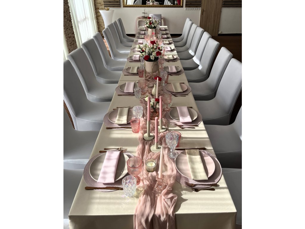 Ubrus v béžové barvě je designovým doplňkem pro Vaši svatbu. Ubrus můžete použít na více navazujících stolů. Ubrus je velikostí uzpůsobený pro hlavní tabuli až na zem (2 na sebe navazující stoly, při hlavní tabuli 6 osob, je nutné použití 2 ks ubrusu, aby byly ubrusy až na zem ve předu i ze stran). Ve stejné barvě máme i ubrus na bistro stolky. Ubrus je málo mačkavý, pevný, neprůhledný a bez vzoru. Kraje ubrusů jsou obšité. Ubrusy se vrací nevyprané. Cena půjčovného je na 1-5 dní.