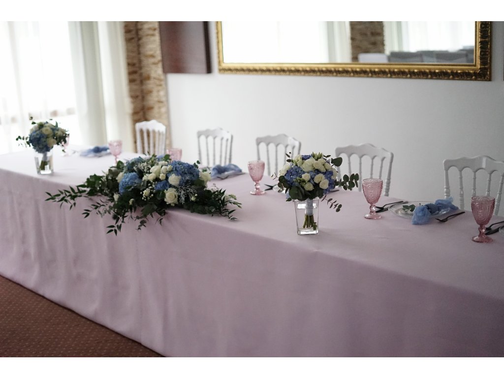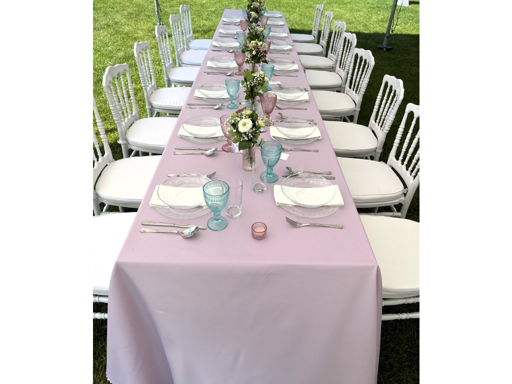 Ubrus ve fialkové barvě je designovým doplňkem pro Vaši svatbu. Ubrus můžete použít na více navazujících stolů. Ubrus je velikostí uzpůsobený pro hlavní tabuli až na zem (2 na sebe navazující stoly), takže nemáte nevzhledné spoje uprostřed na stole. Při hlavní tabuli 3 stoly - 6 osob, je nutné použití 2 ks ubrusu, aby byly ubrusy až na zem ve předu i ze stran (při použití 2ks na sebe ubrusy krásně navazují a spoj není skoro vidět, protože jsou bezešvé). Ubrus má teflonovou úpravu - je málo mačkavý, pevný, neprůhledný a bez vzoru. K ubrusu máme i kulaté ubrusy ve stejné barvě. Ubrus je z jedné strany lesklejší a z druhé strany matnější - můžete si vybrat, kterou stranu použijete. Kraje ubrusů nemají na koncích nemají švy a spoje při navazování ubrusů nejsou skoro vidět. Ubrusy se vrací nevyprané. Cena půjčovného je na 1-5 dní.