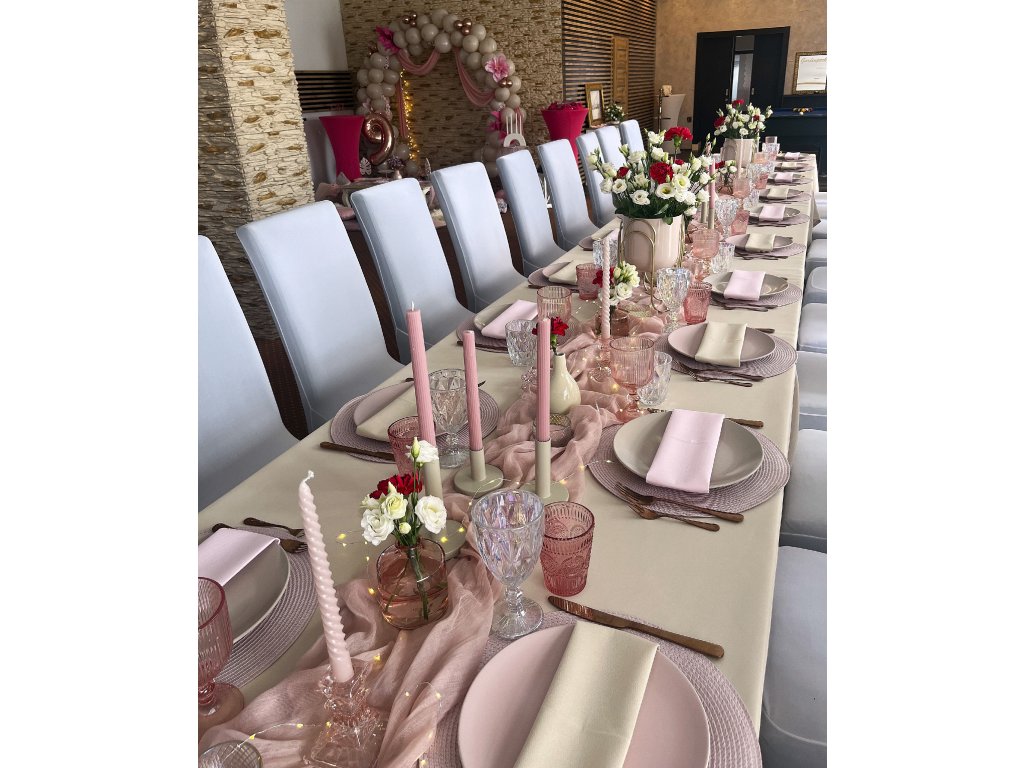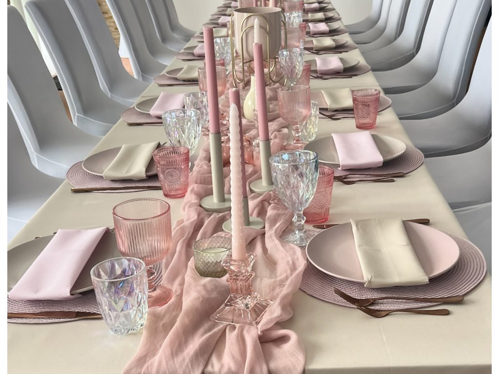 Růžové talíře v romantickém stylu jsou krásným doplňkem pro Vaši svatbu. Talíře můžete použít jen na hlavní nebo celou svatební tabuli, dekorační servírování, sladký koutek nebo raut. Do setu k talířům jsou i táci a etažéry v různých variantách. Do barvy talířů máme i set na sladký bar. Talíře lze mít v myčce. Cena půjčovného je na 1-4 dny.