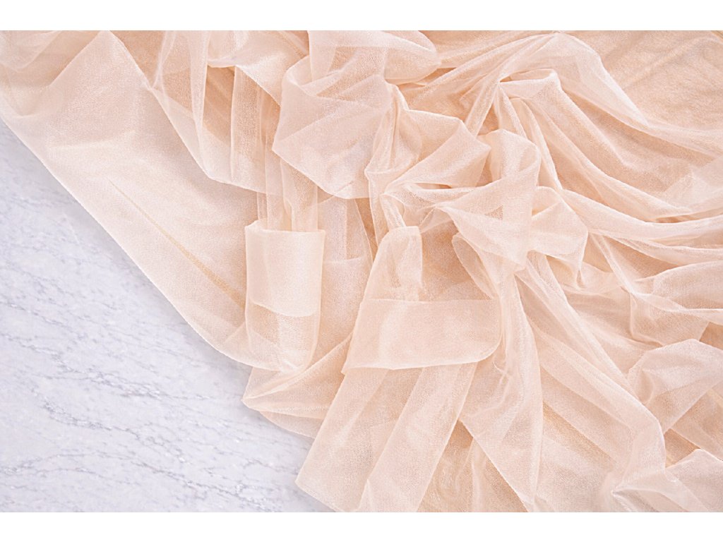 běhoun krepšifon broskvový s jemnými třpytkami (3m/ 3,2m/ 3,5m/ 6,5m/ 10m), vyžehlený