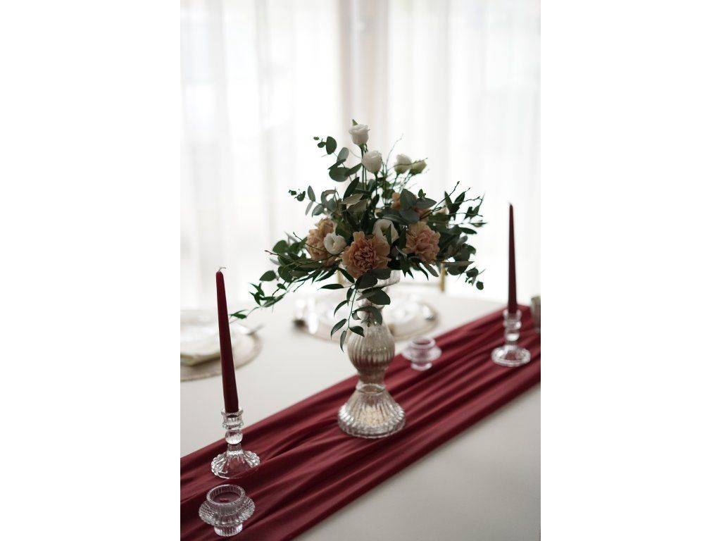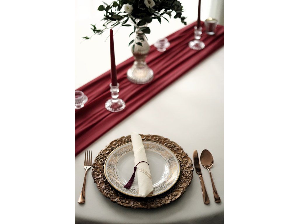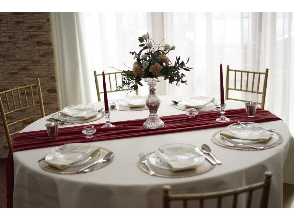 Látková běhouny (středový pás) na stůl jsou designovým doplňkem pro jakoukoli slavnostní událost. Designové běhouny krásně doladí Vaši slavnostní tabuli do nejmenších detailů. K běhounům do setu máme i další dekorace ve stejné barvě. Délka běhounu je 3,5m, tak aby jste u kulatých stolů měli z každé strany běhouny až na zem i s lehkým převisem na zemi. Běhouny můžete použít na stoly kulaté, hranaté, vysoké bistro stolky, na sladký bar nebo na slavobrány na obřad. K běhounům máme i látkové ubrousky ve variantě klasik i přírodní gázovina. Kraje běhounů jsou obšité. Jedná se o materiál, který se často nemusí ani přežehlovat. Běhouny se vrací nevyprané. Cena půjčovného je na 1-5 dní.