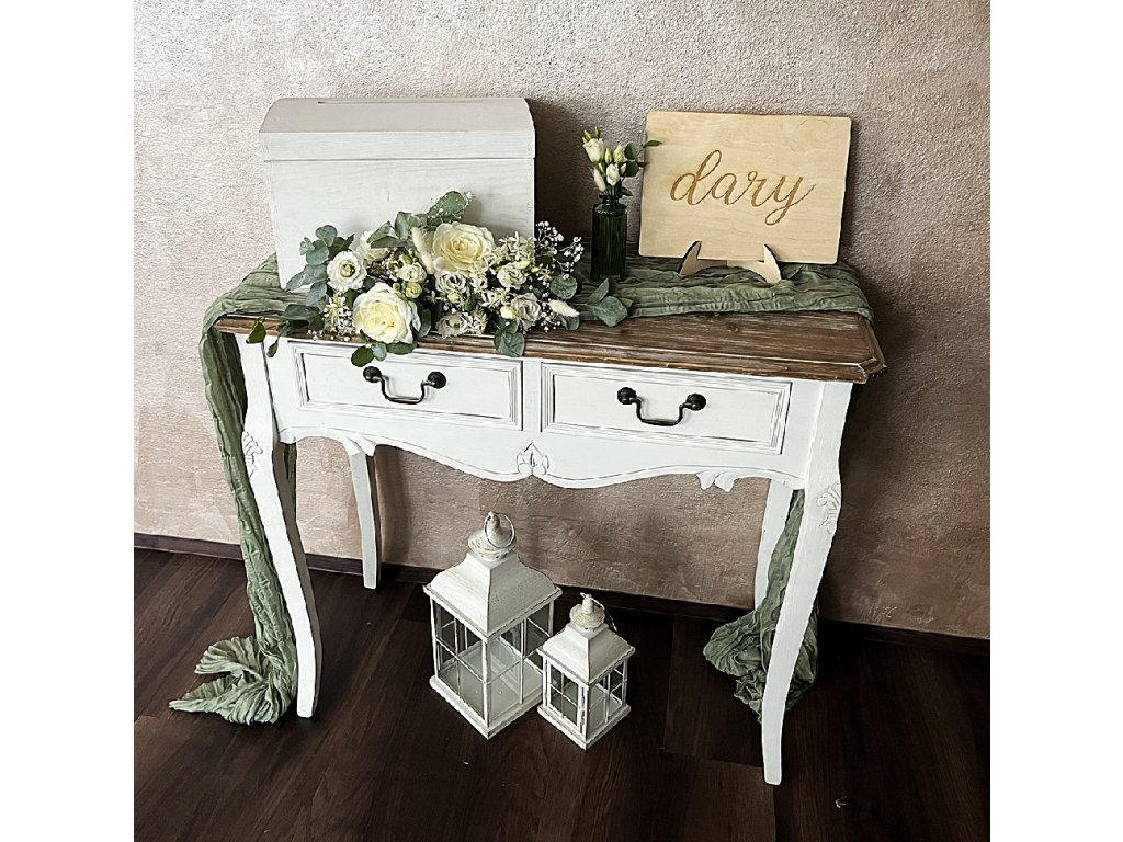 Dekorační truhla na přání je krásným doplňkem pro jakoukoli slavnostní událost. K truhle máme do setu i Vítací cedule, cedule na zasedací pořádek, cedulky sladký bar, svatební dary, relax koutek, pánský koutek, fotokoutek, dětská koutek, psí koutek a čísla na stoly. Pokud zvolíte i variantu s textem na přání, pošlete nám do emailu prosím text a písmo nebo fotografii designu textu a jakou barvu písma si budete přát. Cena půjčovného je na 1-5 dní.