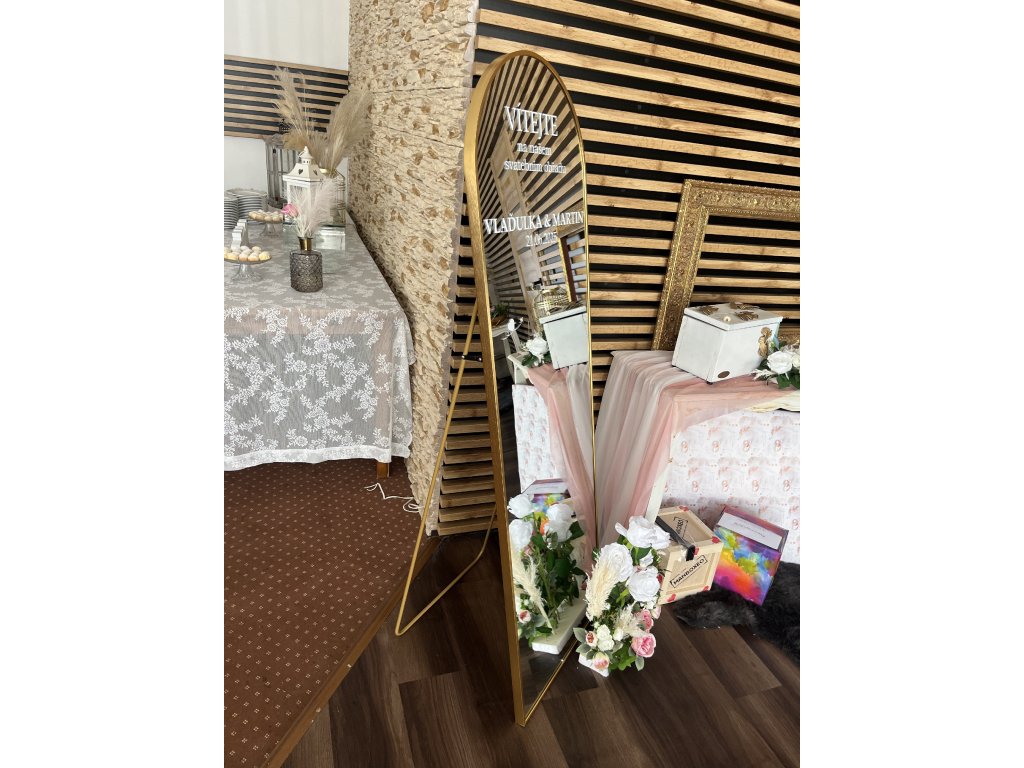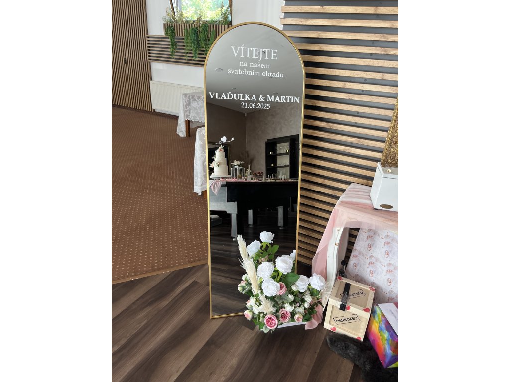 Velké stojící vítací selfie zrcadlo je designovým doplňkem pro jakoukoli slavnostní událost. Zrcadlo je dost veliké pro komfortní focení 2 osob. Můžete využít variantu samotného zrcadla nebo již s připraveným nápisem dle Vašeho výběru - barva nápisu je bílá (na poptání je možné udělat i barvu zlatou, černou a stříbrnou - v základní nabídce máme bílou barvu, protože je nejlépe vidět).V případě zapůjčení zrcadla bez nápisu, kdy si nápis lepíte vlastní sami se zrcadlo vrací čisté bez nálepky - pokud máte zrcadlo od nás s nápisem již hotovým, vracíte i s nalepeným nápisem ten odstraňujeme my. Cena půjčovného je na 1-4 dní.